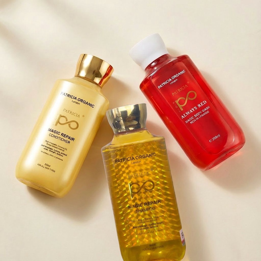 بكج الاستحمام الملكي من Patricia Organic يمنحك تجربة استحمام فاخرة تشمل شامبو وبلسم وشاور جل بتركيبة لطيفة تنظف وتغذي الشعر والبشرة