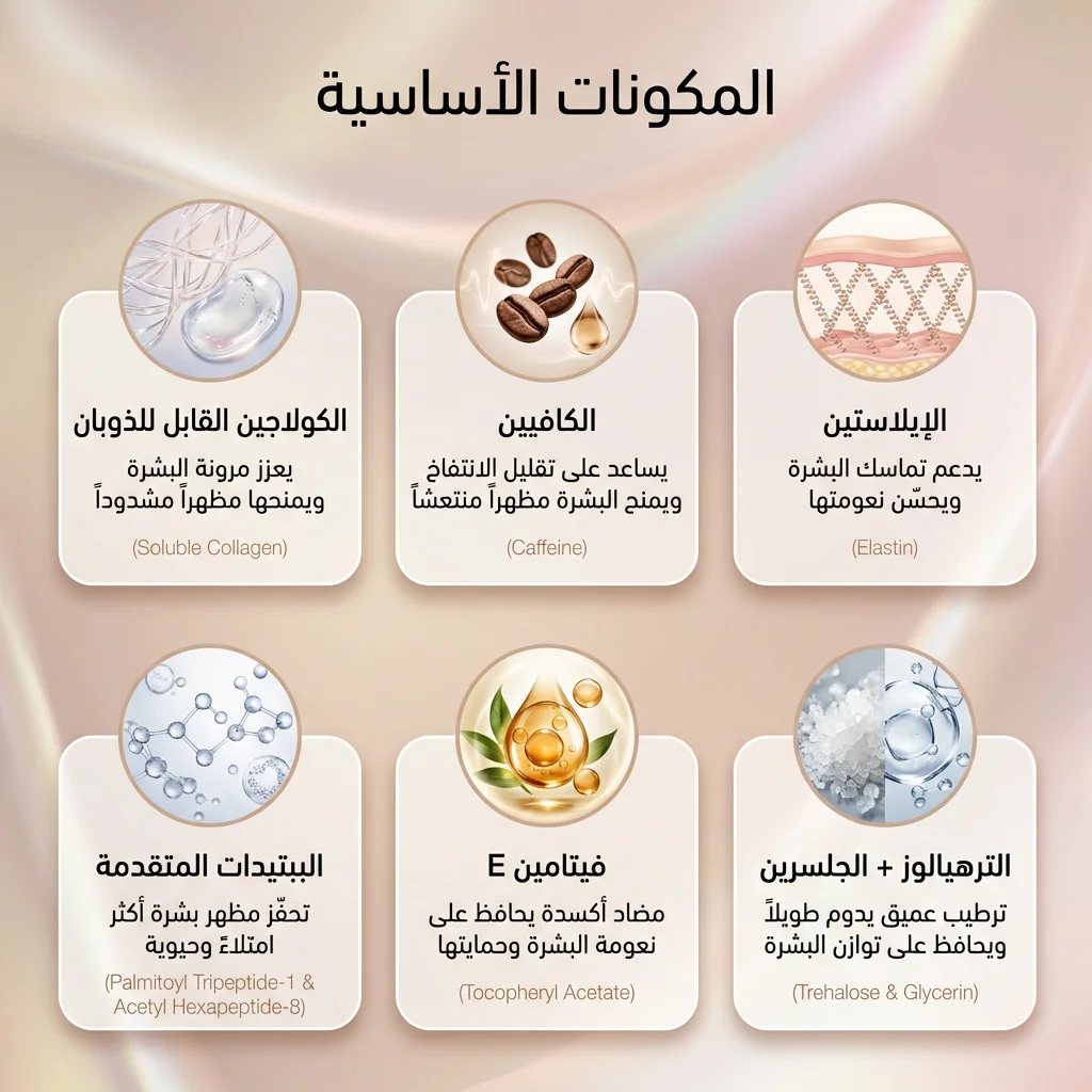 تركيبة علاجية عالية التركيز تحتوي على الكولاجين، الكافيين، الإيلاستين، والببتيدات المتقدمة، تعمل على إعادة بناء ألياف الجلد، تنشيط الدورة الدموية حول العين، وشد الجلد المترهل بفعالية واضحة.