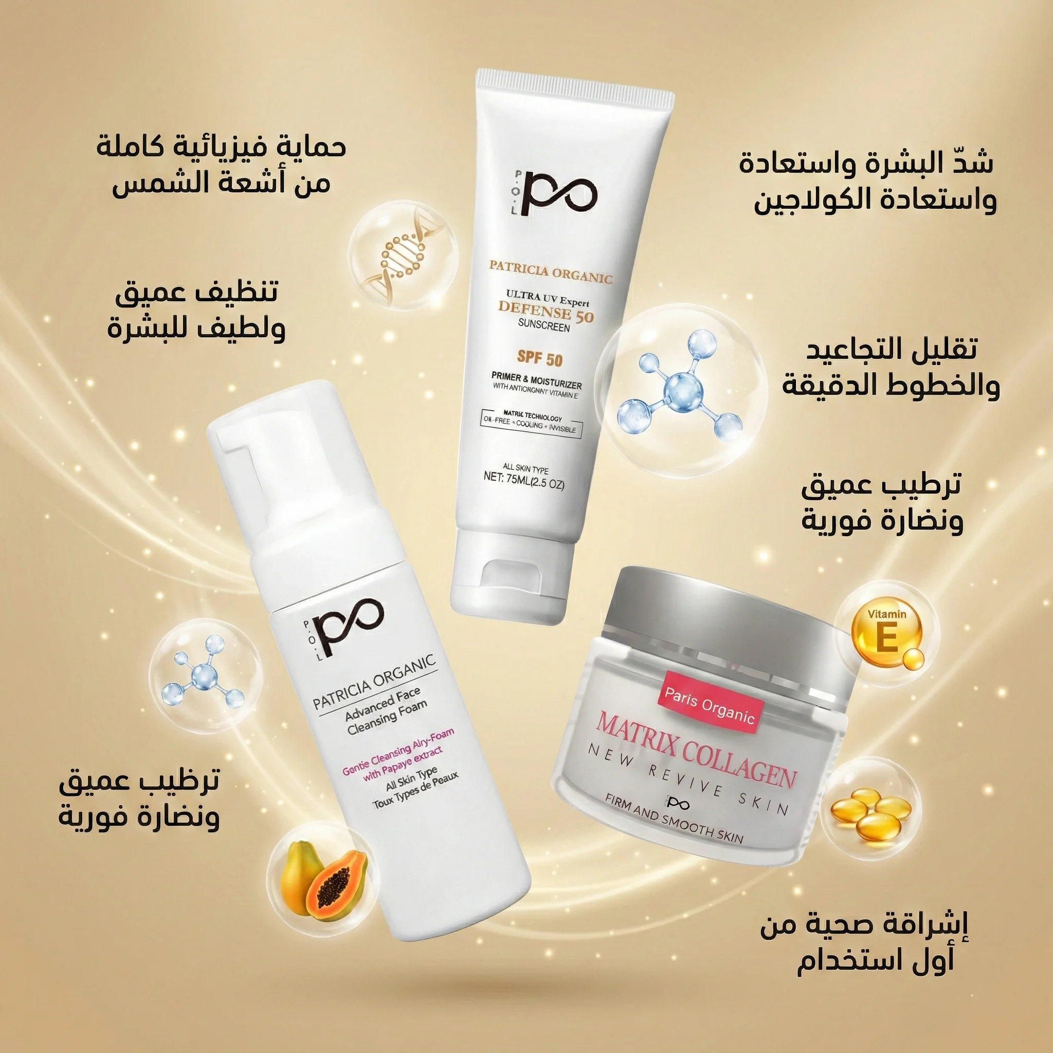 بكج متكامل يجمع ثلاث خطوات أساسية للعناية بالبشرة: تنظيف عميق، شد وتجديد، وحماية من الشمس. صُمّم ليمنحك نتائج واضحة في النعومة، الشد والإشراقة، ومناسب للرجال والنساء ولكل أنواع البشرة.