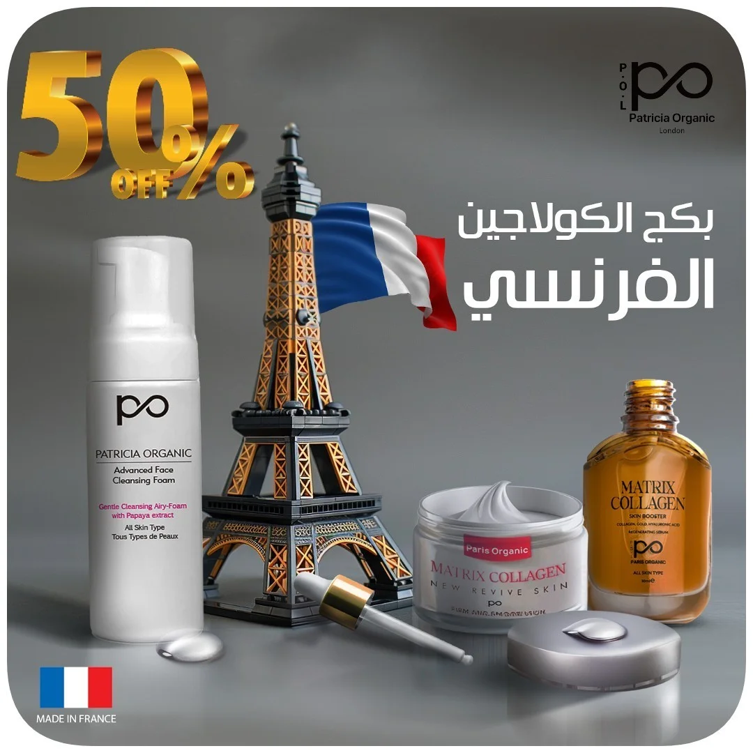 بكج علاجي فرنسي بالكولاجين يضم رغوة تنظيف، سيروم كولاجين، وكريم شد لإحياء البشرة، تقليل التجاعيد، وزيادة النضارة والمرونة