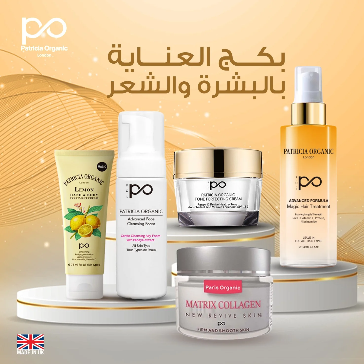 بكج متكامل للعناية بالبشرة والشعر من Patricia Organic يشمل تنظيف البشرة، شدّها، توحيد لونها، وترطيب الشعر وتقويته بتركيبات بريطانية وفرنسية