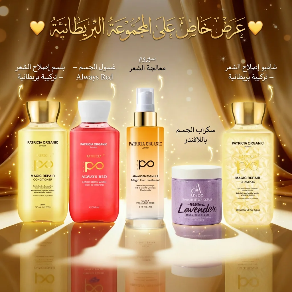 بكج الاستحمام والعناية الملكي من Patricia Organic يجمع شامبو، بلسم، غسول جسم، سكراب وسيروم معالجة الشعر في روتين متكامل يمنح نظافة، نعومة،