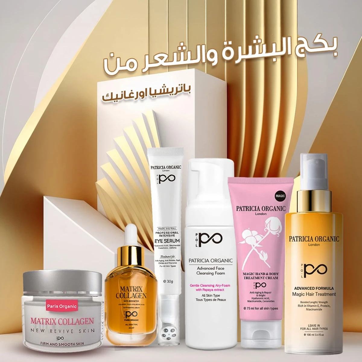 بكج فاخر يجمع منتجات العناية الأساسية من Patricia Organic London في روتين واحد متكامل، مصمم لتنظيف البشرة، علاج علامات التقدّم في السن، تعزيز الإشراقة والشد، مع عناية